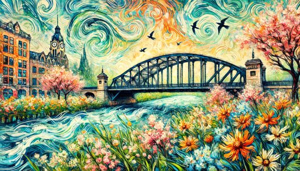 Brush strokes alive with color adorn the canvas, painting a vibrant and modern take on the classic DuSable Bridge. Observers are swept into a fantastical Chicago riverside, where spring bursts in wild hues. Above water that swirls in energetic blues and foamy whites, a historical bridge arches gracefully, linking two bustling riverbanks. Surrounding buildings, rendered with a slight abstract twist, echo the vitality of the city's renowned architecture. Meanwhile, specks of cherry blossoms and lush greenery soften the urbanity, whispering stories of rebirth and renewal. Throughout this scene, birds glide and flowers bloom, inviting the viewer to inhale the fresh, pollen-dusted air, typical of a Midwestern spring. A true symphony of colors and forms, this art piece encapsulates the spirit of Chicago married with a burst of imaginative fantasy. *** About DuSable Bridge: The DuSable Bridge, formerly known as the Michigan Avenue Bridge, stands as an iconic figure in the Chicago skyline. Opened in 1920, this double-deck, bascule-style bridge spans the Chicago River and marks the start of the famous Magnificent Mile. Named after Jean Baptiste Point du Sable, regarded as the first non-indigenous settler of Chicago, the bridge not only serves as a vital artery for traffic but also as a historical monument, showcasing relief panels that depict scenes from Chicago’s early history. Its strategic and symbolic significance continually attracts tourists and locals alike, making it a celebrated landmark in the city's architectural and cultural tapestry.