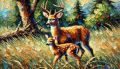 Majestic White-tailed Deer with Cub: A Vivid Impasto Oil Painting