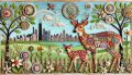 Majestic Deer and Cub against the Chicago Skyline in Vivid Art