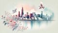 Ethereal Chicago: Watercolor Skyline with Birds and Blooming Florals